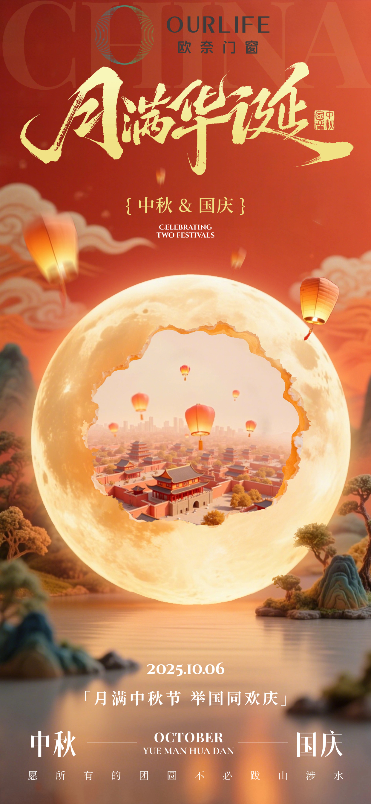 金秋送爽,丹桂飄香,在中華人民共和國(guó)成立 76 周年與傳統(tǒng)中秋佳節(jié)雙節(jié)同慶之際,吉林省歐奈門窗有限公司向全體員工、海內(nèi)外客戶、合作伙伴及社會(huì)各界友人致以最誠(chéng)摯的節(jié)日祝福,恭祝大家節(jié)日快樂、闔家幸福、萬事如意!